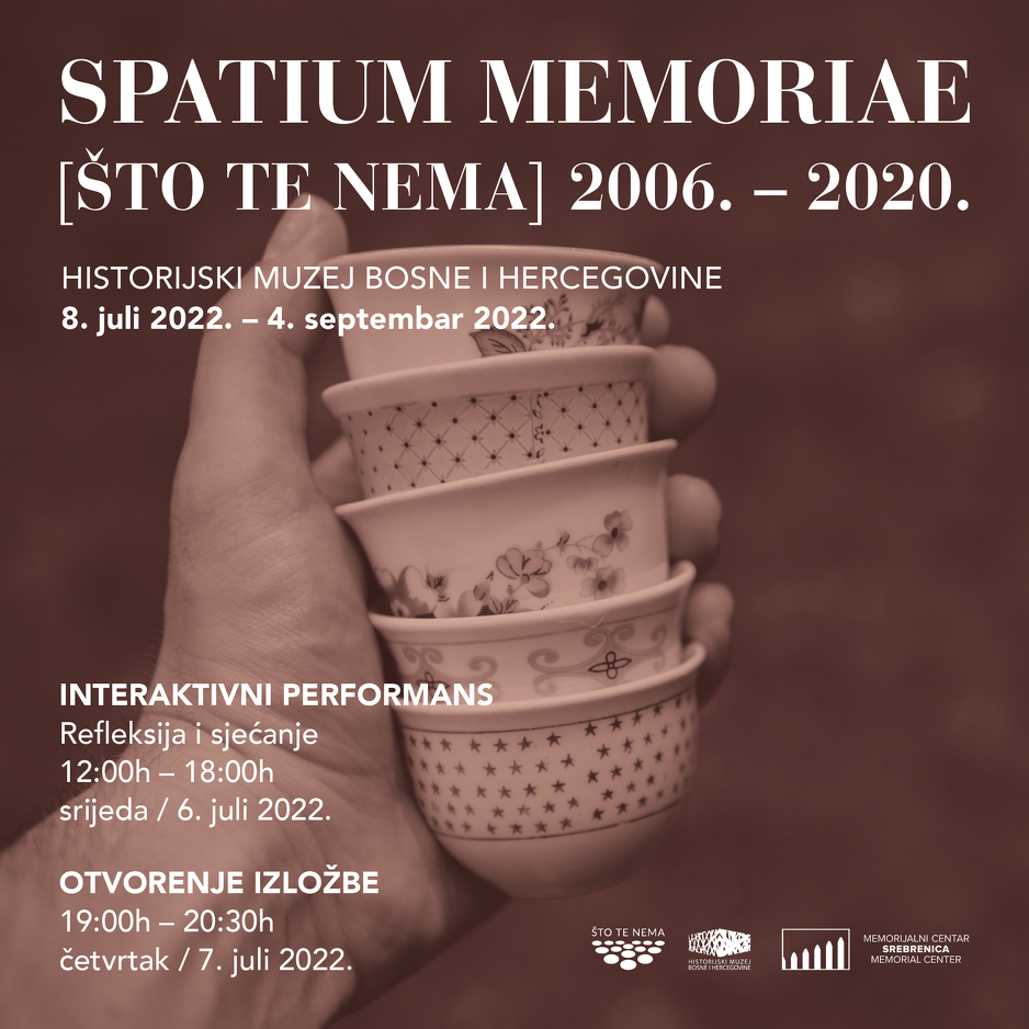 Otvorenju izložbe “Spatium Memoriae (Što te nema)” prethodit će interaktivni performans “Refleksija i sjećanje” u četvrtak 6. Jula 2022. Umjetnica Aida Šehović poziva sve zainteresovane da učestvujući u procesu redanja fildžana, te izgradnje arhive spomenika “Što te nema” u Historijskom muzeju BiH u Sarajevu. Performans će se održati u periodu od 12 do 18 sati, a prijave za učešće se mogu izvršiti ovdje.