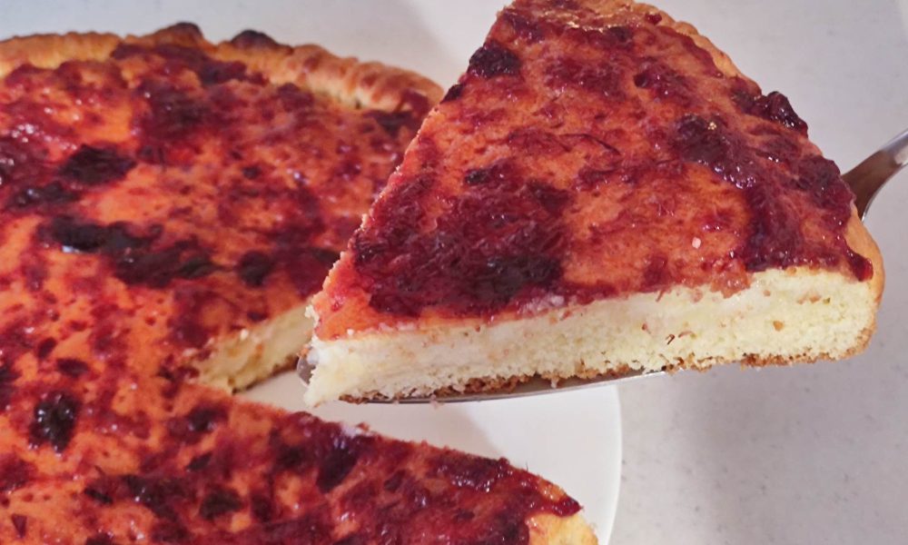 Kuhati na laganoj vatri uz stalno miješanje dok se ne zgusne krema. Izrezati 1 veću jabuku i staviti u kremu – premazati preko tijesta i preko staviti ostatak tijesta.